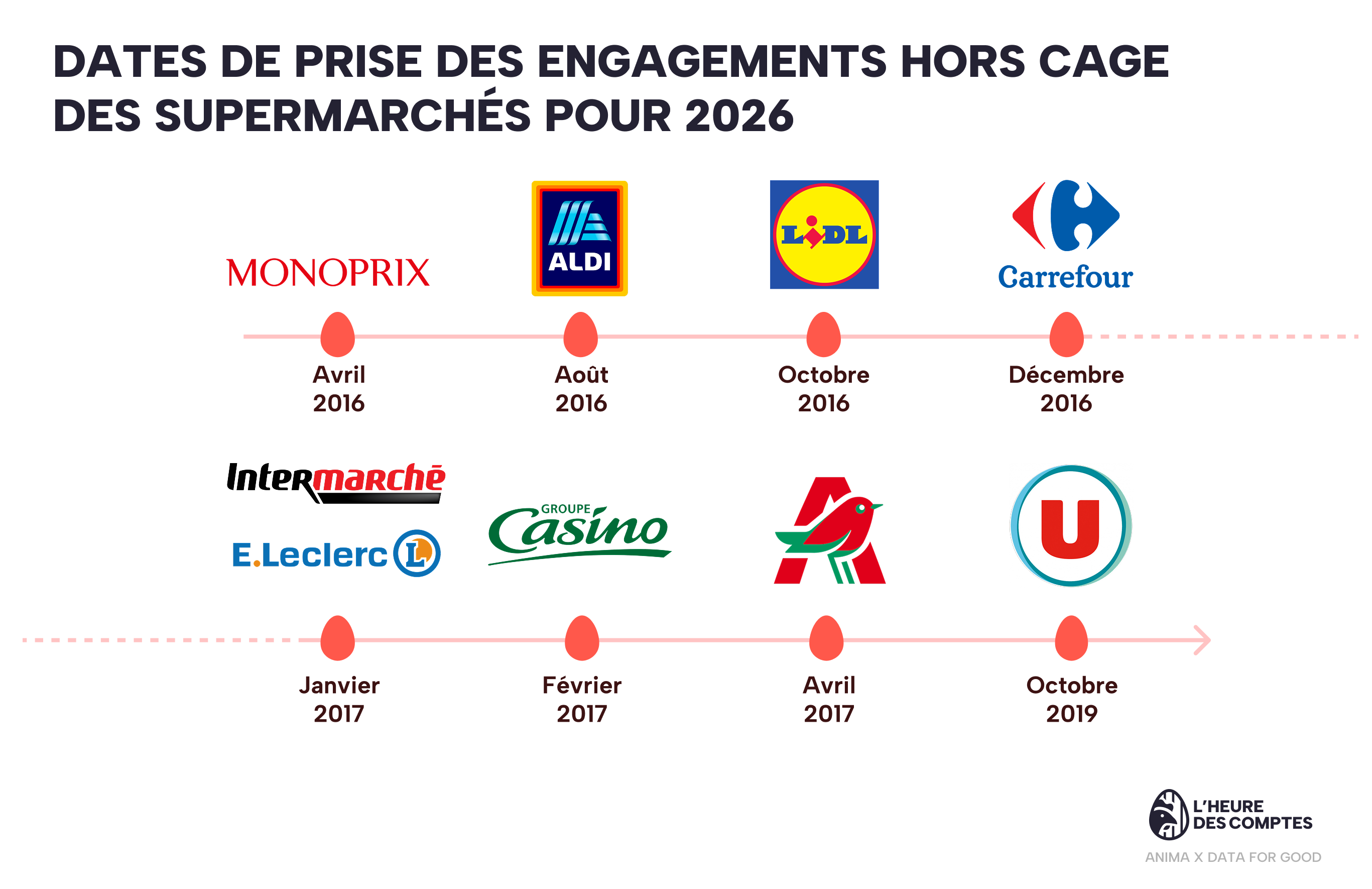 La presse titrait il y a 10 ans sur les engagements hors cage de Leclerc, Carrefour, Intermarché, U, Auchan, Lidl, Monoprix, et ALDI, pour 2026.'