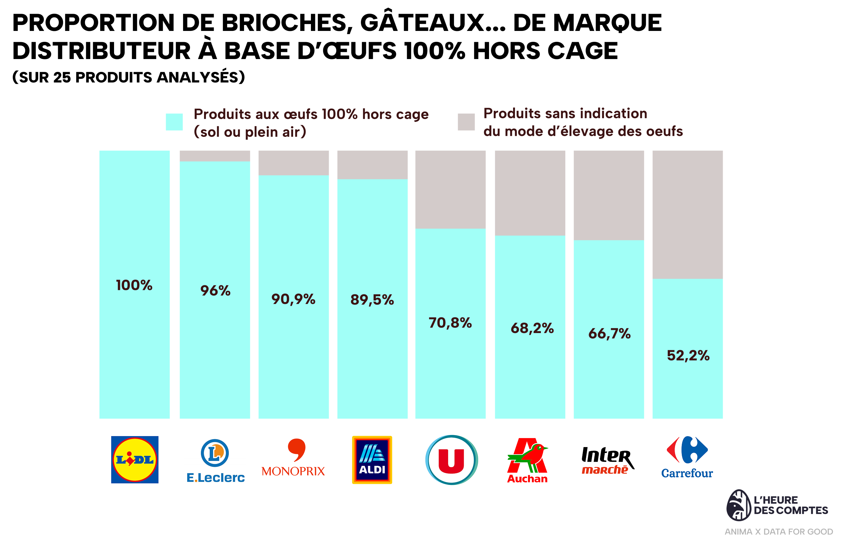Sur les 25 références marque distributeur analysées chez toutes les enseignes, ce sont Lidl, Leclerc, Monoprix, ALDI et Lidl qui vendent le plus de références avec des œufs 100% hors cage (exemple chez ALDI). Beaucoup d'œufs sont utilisés sous forme d'ingrédient dans les produits vendus en grande surface. Les supermarchés se sont engagés à ne plus utiliser d'œufs cage dans leurs marques distributeur à partir du 1er janvier 2026.